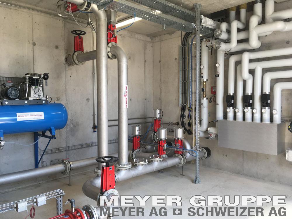 Die Verteilerbaugruppe erlaubt die Beschickung aller angeschlossenen Behälter in jede Durchflussrichtung. Die gesamte Pumpverteilung besteht aus Pneumatik-/ Handschiebern und wird über das Leitsystem zentral gesteuert.