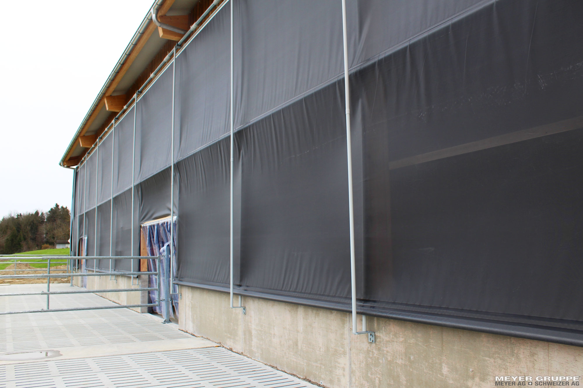 Die Plane ist an der Ober- und Unterseite mit einem aufgeschweissten Keder versehen, in denen Nutenrohre eingeschoben werden.